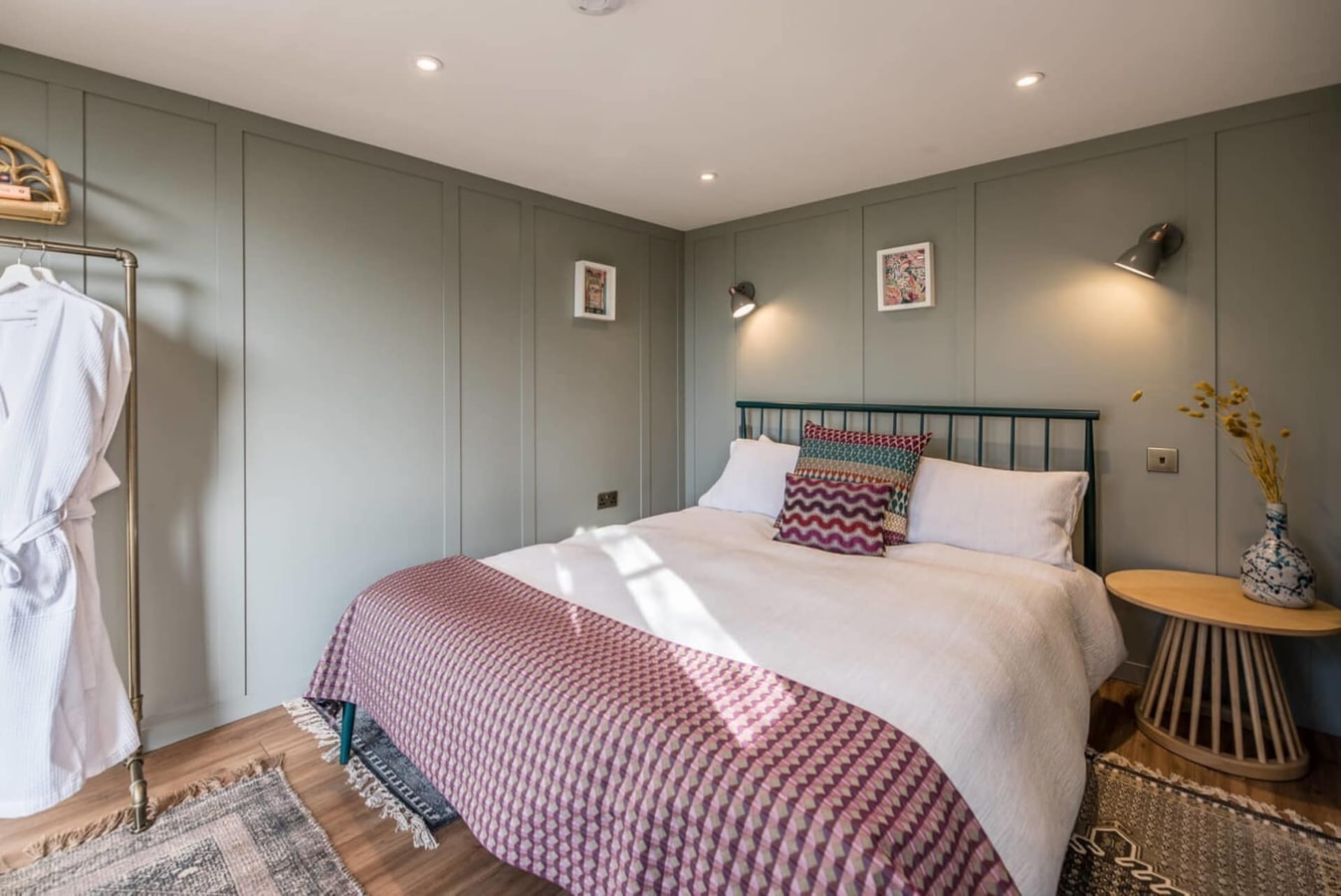 Wake to the view of the fields beyond the deck in a king-size bed in this charming lodge. Additional furniture includes a bedside table, a clothes rail so you can unpack and a side table where the Nespresso machine will be waiting for you.